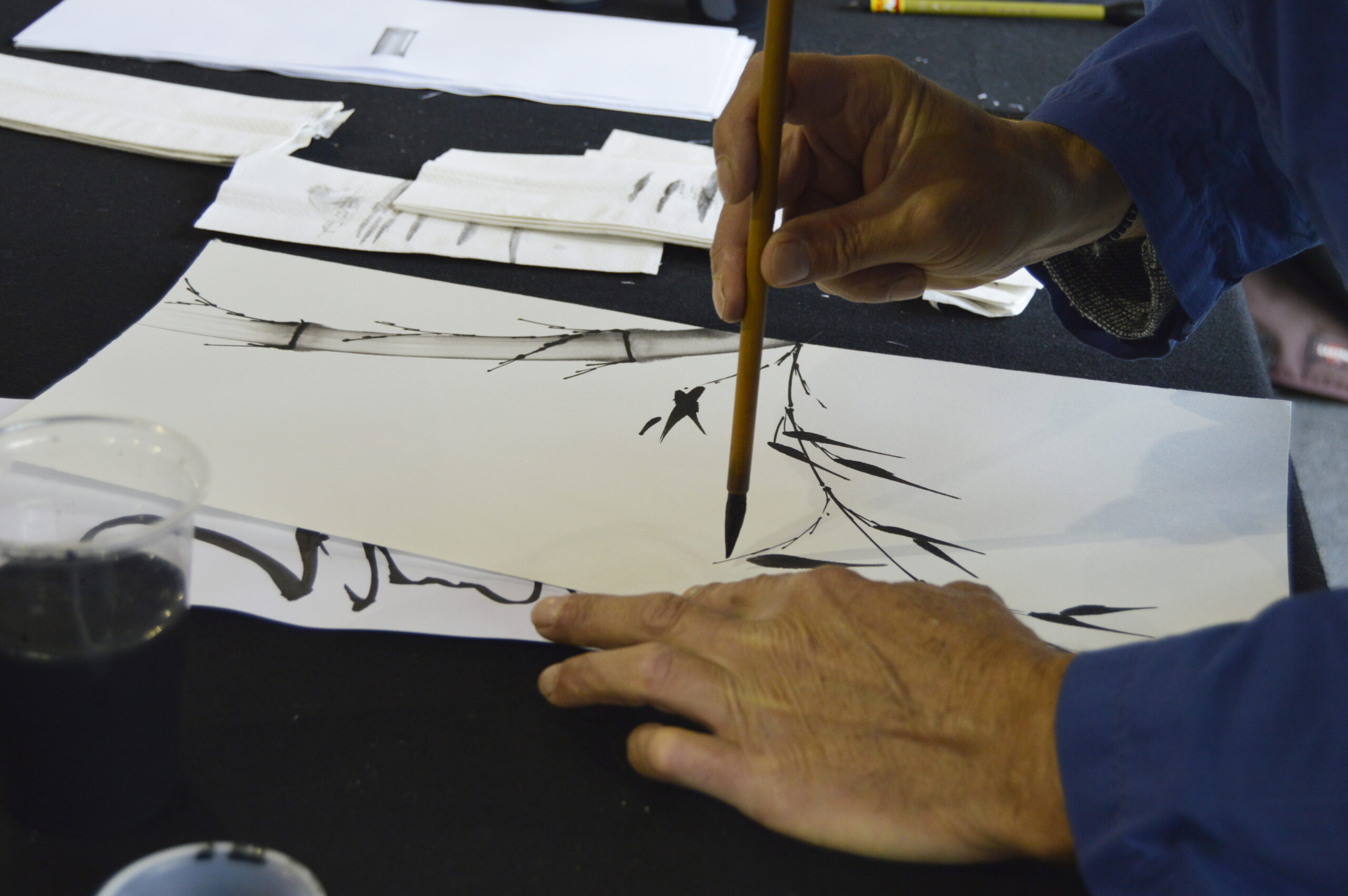 Schauen wir uns zum Beispiel an, was passiert, wenn Sie einen Bambus mit der Sumi-e Technik malen wollen: Sie sitzen (können aber auch stehen) und halten den Rücken gerade. Legen Sie ein Blatt Papier vor sich hin und konzentrieren Sie sich, indem Sie ruhig und natürlich atmen. Lassen Sie alle anderen Gedanken verschwinden. Am Ende bleibt nur ein weißes Blatt Papier im Kopf. Dann lassen Sie das zu malende Bild vor Ihrem geistigen Auge entstehen. Um einen Bambus zu malen, müssen wir seine Konsistenz spüren, wir „sehen“ den Stamm, die Äste, wir „hören“ das Rascheln der leichten Blätter, die von der Luft oder dem Wind bewegt werden, oder auch nass und schwer vom Regen.